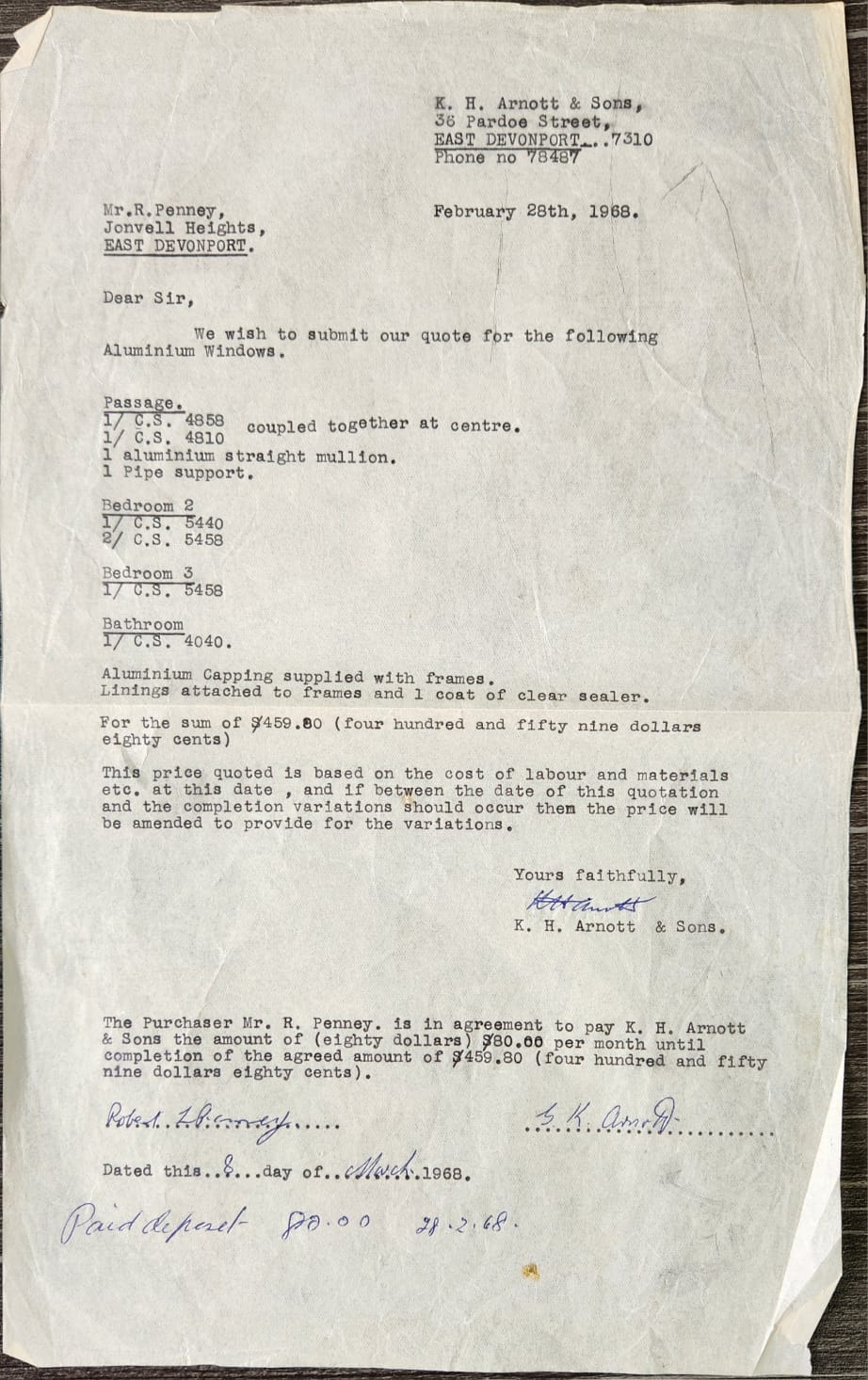 1968. Quote for a Mr Penney. Six items for a total of $459.80 to be paid off $80 per month