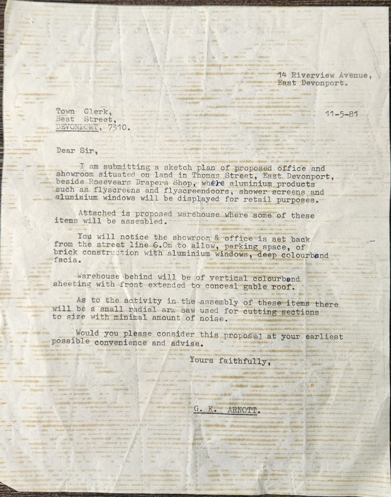 1981. Aluminium Windows outgrows the shared space so Geoff Arnott writes to the Town Clerk requesting permission for a new build.